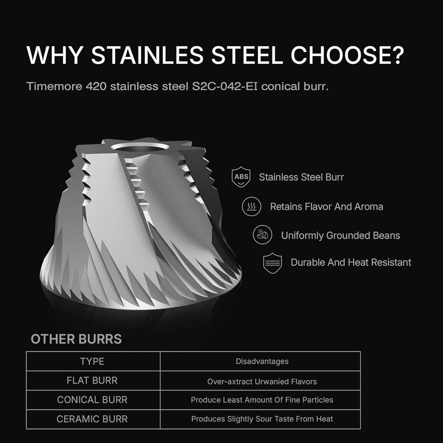 Featuring patented S2C-420-EI stainless steel octagonal burrs, The Whirly grinder is the perfect choice for those who love the classic espresso flavor profile but also enjoy the occasional filter coffee. This burr set delivers elevated sweetness and richer crema while reducing the difficulty of pressure building during extraction, making it ideal for achieving a perfectly balanced shot. We found that it does specially well with medium to dark roasts emphasizing round, integrated flavors. - A battery which outlasts your buzz: