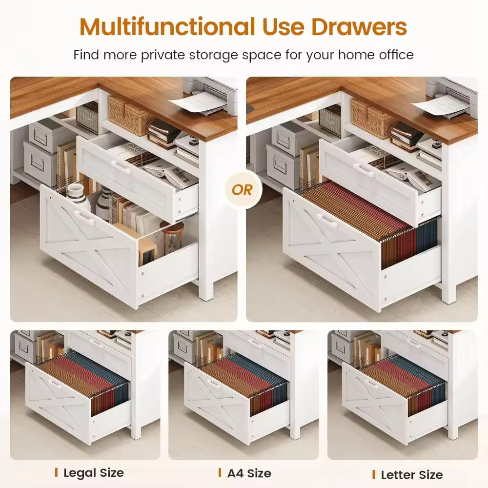 Create a versatile workstation that’ll meet all your needs with this all-in-one l shaped desk with drawers, monitor riser, storage shelves, power outlet and LED lights. It's finished on all sides for versatile placement throughout your office. Information about the farmhouse desk makes it addition to any home office. Create a one-of-a-kind work environment when you add the sophisticated charm and design of this L-shaped desk. This handsome desk will have your office space looking good in no time. Don't know how to store various sizes of documents? Don't worry, the farmhouse L desk with a file drawer can hold 3 sizes of files - Legal/Letter/A4, and a box drawer can place home or office items. The l shaped desk can be for printers, files, books leaving large space for writing, studying, and other home office desk activities. The white gaming desk l shape comes with an RGB LED light strip, remote control via APP, change with the rhythm of the sound and music. And with the timer function, just enjoy it in a smart way, creating a gaming and a working atmosphere. Light Up Your Gaming with an LED Light Strip. Our charging station includes 2-Outlet & 2 USB Ports to provide power for up to 4 devices simultaneously. Power outlet allows you to charge cell phones, tablets, notebooks, etc. This 55 inch l shaped desk offers ample workspace for home offices or gaming accessories. To make assembling this sturdy l shaped desk as effortless as possible, we have included clear and detailed instructions, and numbered parts. If your white desk arrives damaged, scratched, or missing part, please feel free to contact us, we will send you a free replacement or offer a partial refund