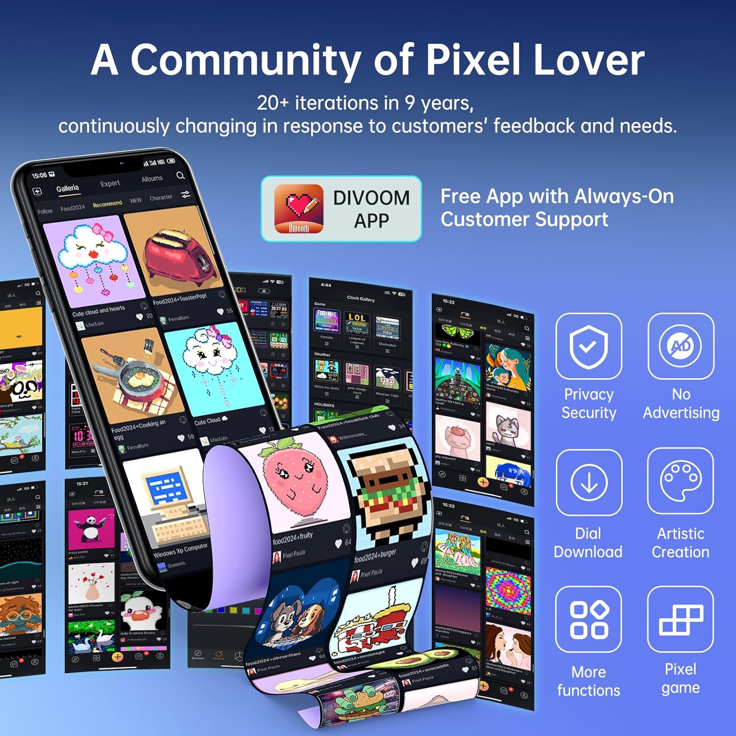 Our app allows you to freely create screen patterns and all data dials. It's not just a captivating desktop decoration or digital picture frame—it's your intelligent life assistant. Practical dials include a world clock, real-time weather updates, and special holiday calendars, which help you manage time and tasks effectively. The intelligent data dials display your virtual assets, such as stock exchange rates, social media follower counts, and individual game data, providing you with comprehensive insights at a glance. - Pixel Art Playground: