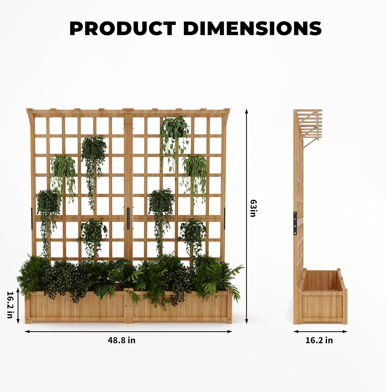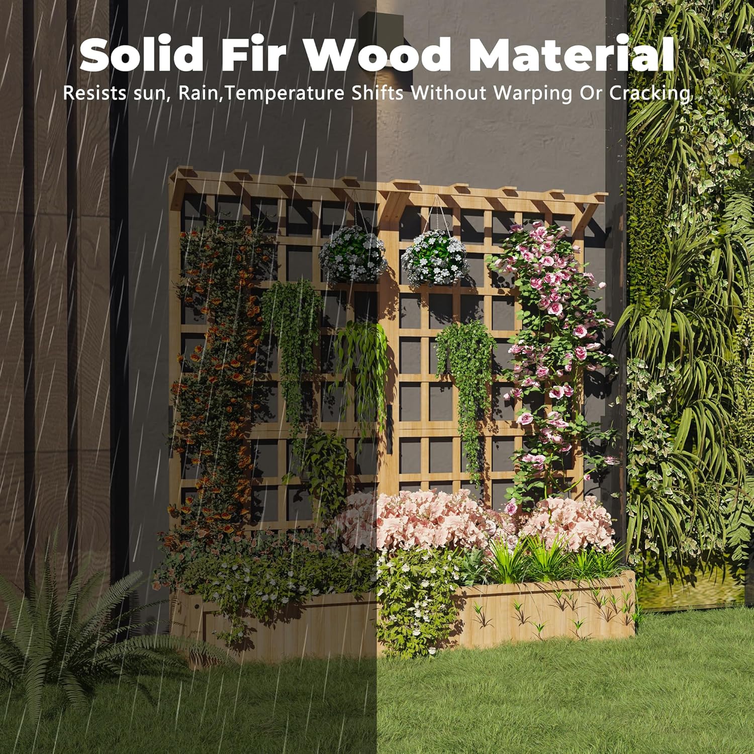 The sturdy wooden trellis supports climbing plants like roses, beans, or ivy, adding height and visual interest. Durable lattice design holds vines securely, transforming your planter into a living wall or garden centerpiece.