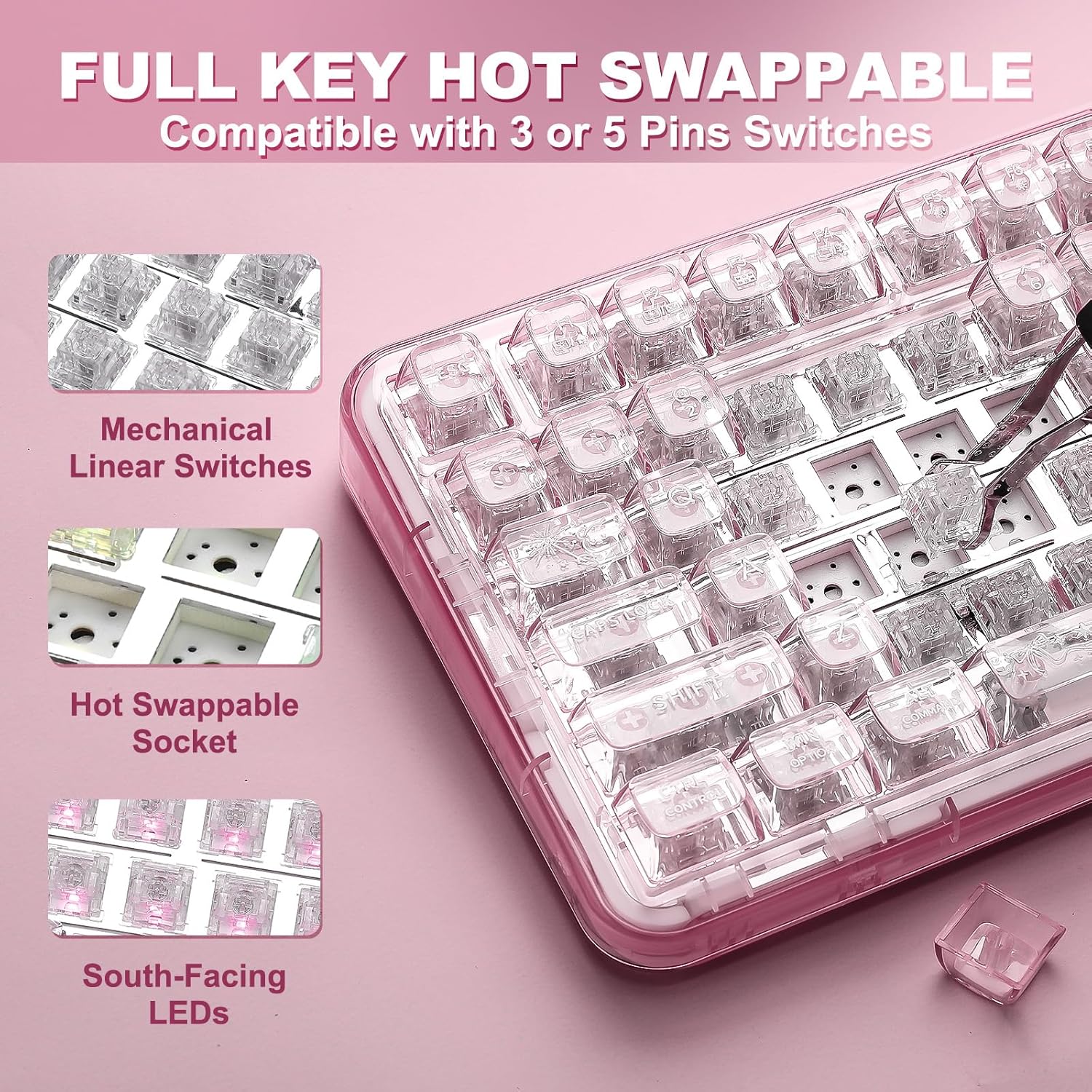 Hot-Swappable: Full-key hot-swappable, supports 3-pin or 5-pin mechanical keyboard switches.